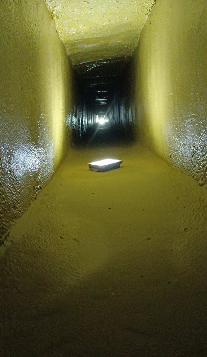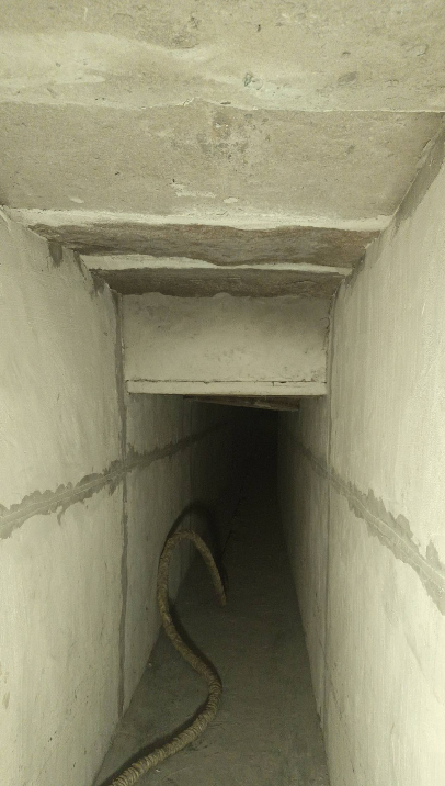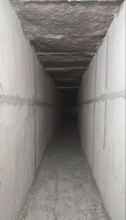 管段长180.5米,方沟顶板为条石板,墙面底板是砖砌基材,该段方沟宽0.9米,截面高度包括1.1米、1.35米、1.5米、1.7米、1.9米等多种高度结合,使用高强度聚氨酯喷涂工艺能很好的解决一个管段不同尺寸之间的修复。